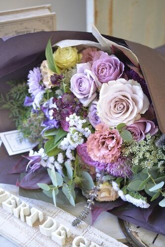 タイトルでバレバレ わかこ です⸜(*ˊᗜˋ*)⸝! 写真は11月のフレッシュグリスペシャル クラス!バラを5種類も使用する贅沢なアレンジ!秋はバラが豊富で輪も大きく、周年出回ってますがオススメな季節です☺✨ 今日は突然LABOに大きなヤドリギが!!!!頭に実がべち…
